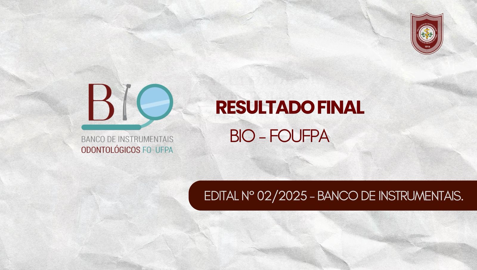 A Faculdade de Odontologia da UFPA torna público o resultado final do chamamento público para solicitação de materiais do Biobanco/UFPA Edital n° 02/2025, além da agenda de recebimento dos materiais aos discentes.